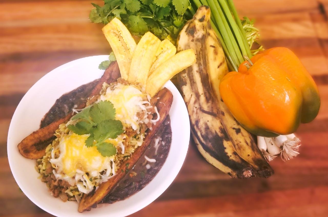 yellow rice,seasoned vegan crumbles, black beans, jack & monterey cheeses and seared plantains.